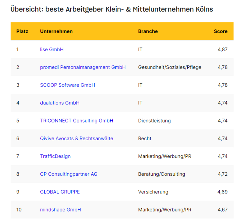 Dazu wurden alle Bewertungen herangezogen, die Kölner Unternehmen von ihren Beschäftigten erhalten haben, unabhängig von Berufsgruppe oder Karrierestufe. Um in die Auswahl zu gelangen, mussten unter anderem folgende Bedingungen erfüllt sein: